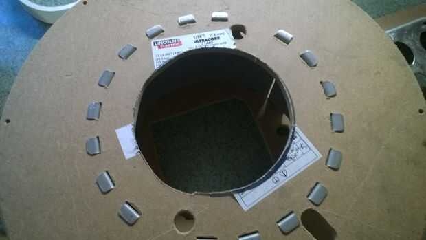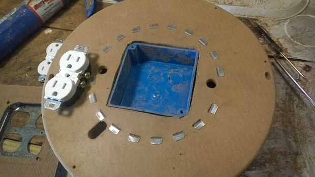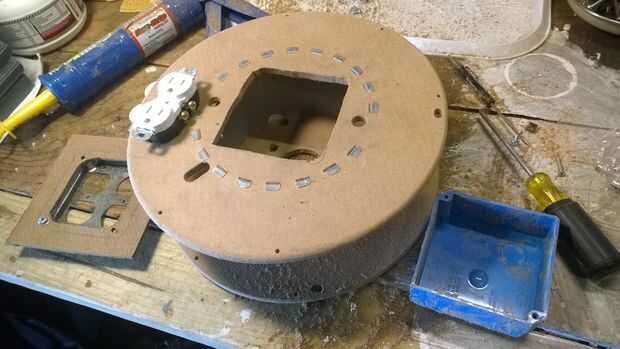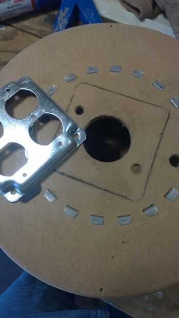 Tomó un poco de maniobras con el tamaño del agujero para poder ajustar las piezas a través de sin hacer el agujero demasiado grande. Al final tuve que hacerlo más grande que quería así que usé un trozo de tablero duro como una placa de montaje. (Me olvidé de mencionar antes. También tuve por lado.) Me olvidé de tomar una foto de la placa de montaje después de que se ha hecho. Lija en los bordes de la misma ayudar a verse mejor. En retrospectiva, me gustaría que había cortado un pedazo más grande y la placa de montaje redondo para cubrir completamente las lengüetas de metal en la parte superior de la bobina. Han cortado un agujero más grande que habría facilitado las cosas un poco más tarde. También corte las pestañas un par la caja eléctrica.