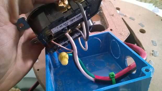 I corte el enchufe, los cables pelados y funcionó a través de un agujero que acaba de ocurrir que el tamaño perfecto y punto. No puedo garantizar que tu carrete sea tan cooperativo así que hacer lo que tienes que hacer. He perforado dos agujeros pequeños en la parte inferior de la caja eléctrica y utilizar una brida para asegurar el cable. A continuación, solía el desecho de alambrado de casa de conectar el enchufe de dos conjuntos, luego sujeté el cable al otro conjunto de conexiones en uno de los conjuntos de encaje. Había conexión a solo tierra por el sistema así que a la izquierda una cola viene de uno de ellos y utiliza una tuerca para cables para conectar los cables de tierra. Es un poco difícil de ver en la foto, lo siento no haz uno mejor.