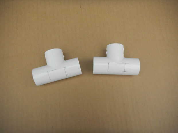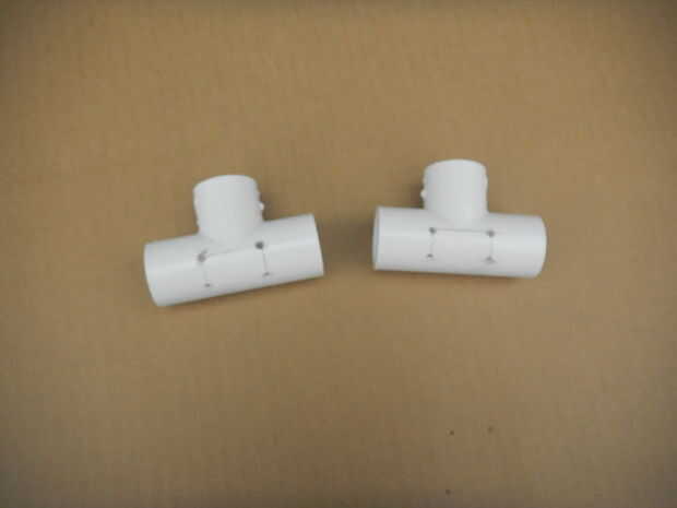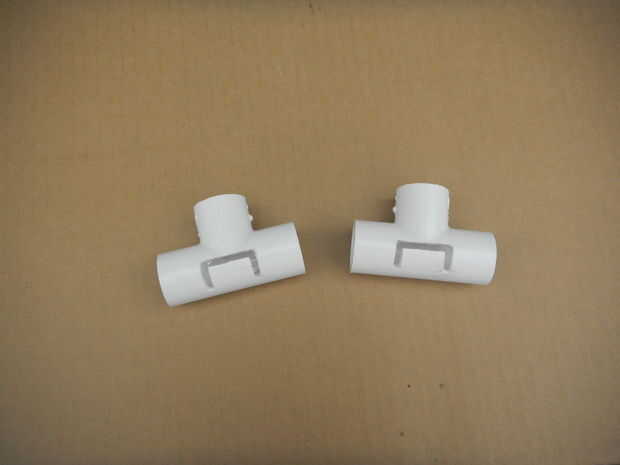 Dos ¾" tomar de camisetas, para hacer invierten agujero U en ellos. Marque una línea de U invertida en medio de una t como ½"+ nivel 1 1/8" + abajo ½". Perforaciones con broca de 9/64" de la broca en extremos y las esquinas de la línea. Orificio de la U invertida con cincel o un cuchillo. La anchura del orificio permite el grosor de un 1 ½" tornillo mover suavemente en ella. Necesitamos dos ¾" tes con agujero de U invertida.