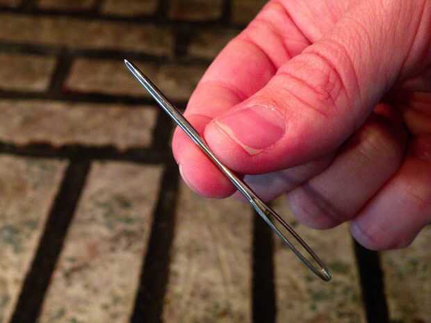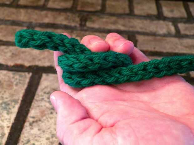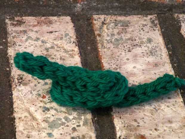 La primera tarea es la forma de la bobina de hilo de punto en una forma acorde con su lagarto frío. Para ello, manojo de encima de la media del segmento de punto hilo de carrete doblando sobre la cuerda varias veces. Dejar 3 a 4 pulgadas de la cola y 1-2 pulgadas en el cuello, cabeza. Usando una aguja grande, enhebrada con hilo (del mismo color que utilizó para carrete de punto con), unir el cuerpo de su lagarto frío.