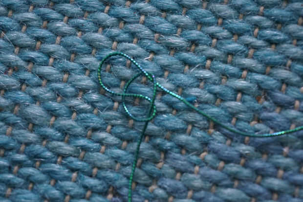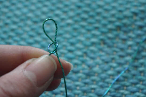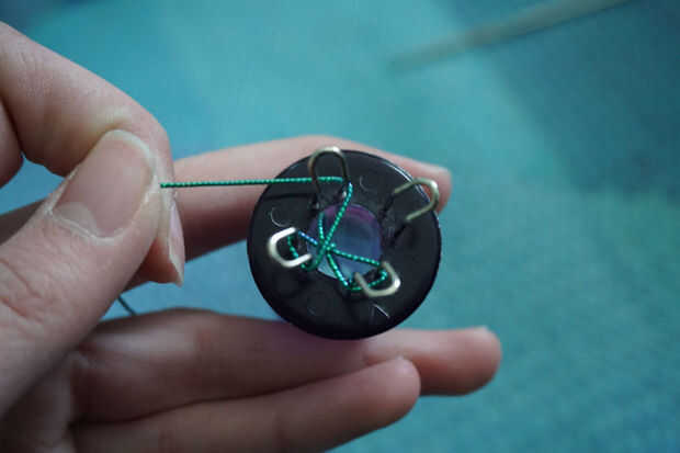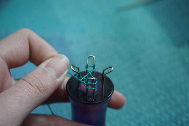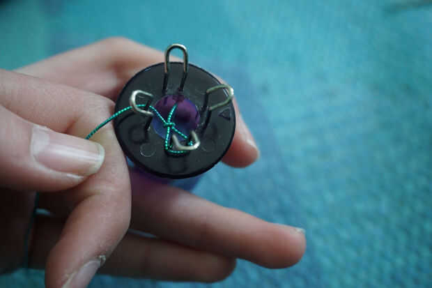 En primer lugar, Enrosque una tonelada de granos en el elástico. No cortar el elástico todavía, porque no sabe cuánto se necesita. Entonces haga un nudo del resbalón y colóquelo en una de las puntas de la bobina. Mi carrete tiene una pequeña flecha junto a la primera pata que pones el nudo del resbalón sobre. Si usted hizo un carrete, escoger un punto y marca para saber dónde está el nudo del resbalón. Esto será importante más adelante. Para hacer un nudo del resbalón, tomar el elástico y cruzar aproximadamente tres pulgadas desde el extremo. Luego tomar la parte larga del elástico (no el final, la parte que está con el resto del elástico, véase el cuadro) y tire de ella a través del lazo que hiciste. Coloque ese lazo en la pata marcada. Entonces a raíz de las fotos, lazo elástico alrededor del carrete. Después de hacer el primer patrón de bucle alrededor, no tendrás que volver a hacerlo así para el resto de la pulsera. Sólo tienes que enrollar el elástico en el exterior.