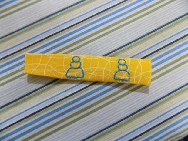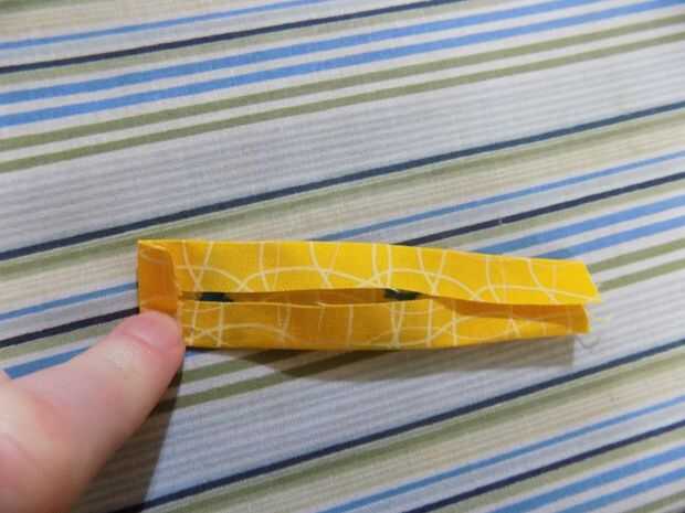 Otra opción, en lugar de la puntada, es usar pegamento para tela. He utilizado Fabri-tac en mi segundo conjunto de peones. Una vez que hayas aplicado el pegamento a la parte inferior del borde presionado, envuelva una cinta de goma alrededor de él mientras se seca durante la noche.