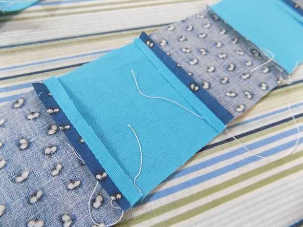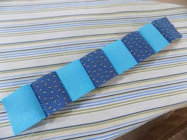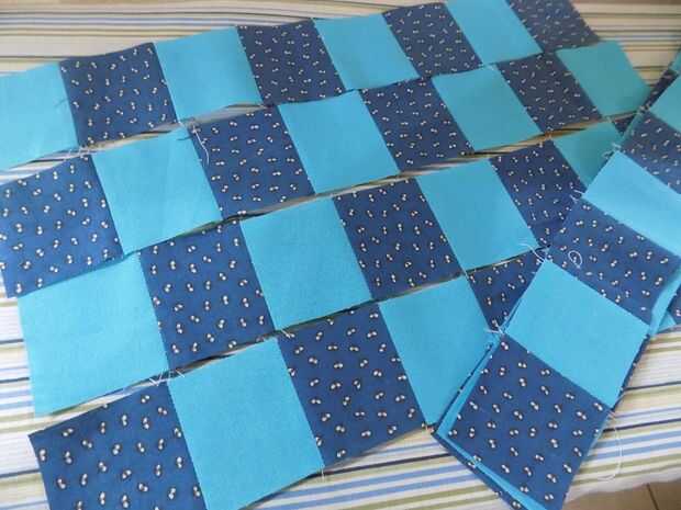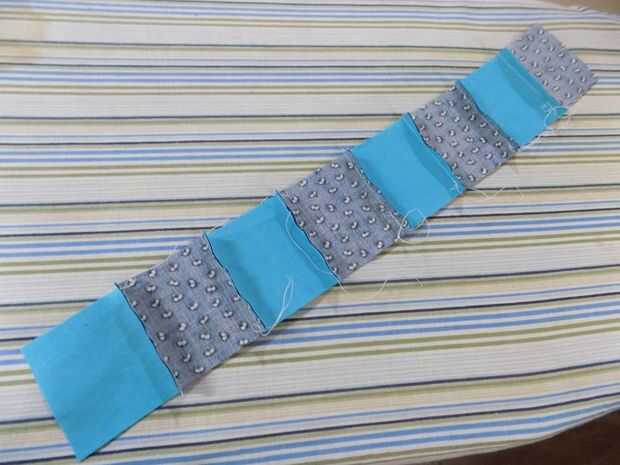 Coser juntos sus plazas en tiras de 8 cuadrados alternando los dos colores.