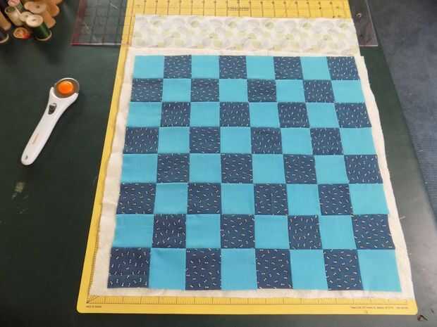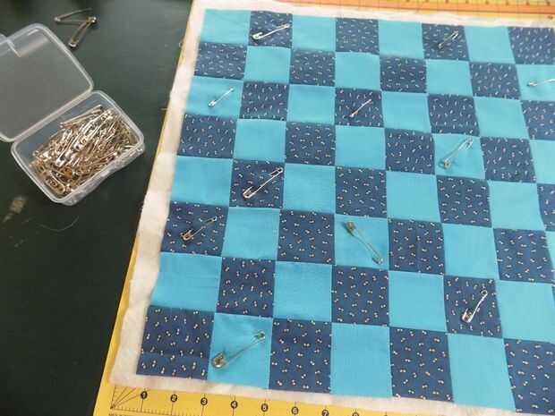 Perno a través de todas las capas cada 6" o algo así. Asegúrese de que prender solo en medio de las plazas. Usted necesita ser capaz de coser entre ellos.