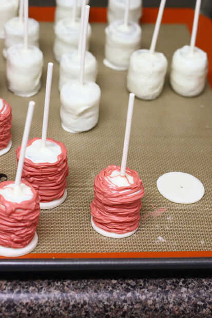 Ahora un anillo de la capa de caramelo alrededor del borde externo en la parte superior de cada conjunto torta pop y dejó la pipa (endurecer) completamente a temperatura ambiente o en el congelador (unos 5 minutos). La finalidad de este es crear una superficie más nivel para los restantes círculos de fondant se adhiera a.