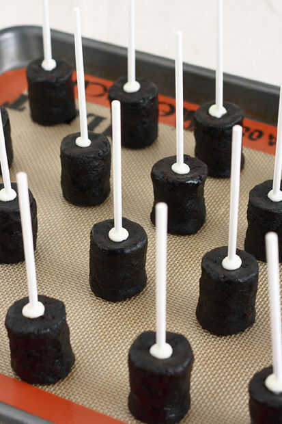 Lugar candy melts y 1 1/2 cucharadas de manteca en un recipiente resistente al calor y microondas durante 1 minuto a fuego medio. Mezcle bien, luego continúe microondas en intervalos de 30 segundos a fuego medio, removiendo entre cada uno, hasta que la mezcla sobre todo derretido y suave. Continuar revolviendo (pero sin golpes--para evitar burbujas de aire en su capa) hasta que la mezcla esté completamente lisa. Sumergir la punta de cada palillo del lollipop en una pequeña capa fundida e inserte a mitad de camino (¡ no más!) en el centro de cada cilindro de pastel. Poner en la nevera [no el congelador] de 10 a 15 minutos a firma para arriba para que la torta no caiga el palo cuando cubierto.