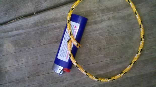Ahora que tienes tus dos secciones de tubería, estás listo para preparar la cuerda.  Primero corte dos tramos de cuerda sobre un pie de largo.  Luego use un encendedor o algunos partidos, su preferencia, para derretir los extremos de la cuerda para evitar que se deshilache.