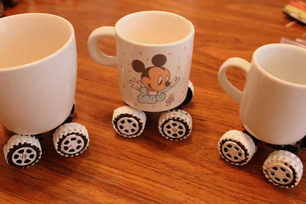 Paso 3: Pegamento caliente 2 establece las ruedas en la parte inferior de cada taza de té ~