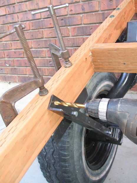 Usando el agujero superior del soporte como guía, perfore un agujero de perno de 3/8 pulgadas directamente a través del riel.