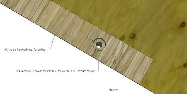 5. Reemplace la broca para la broca de 10mm y ahora usando el centro de su primer hoyo, perfore a través de ambos la madera del marco y de la capa superior, para crear los agujeros de perno. (Imagen 4)