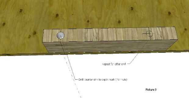 3. Tome el taladro y pala una broca y taladro a esta profundidad + 1,5 cm (para permitir la tuerca) en ambos extremos de la madera del marco en el borde corto. (creando un fregadero contrario para que los pernos no se peguen hacia fuera). (Imagen 3)