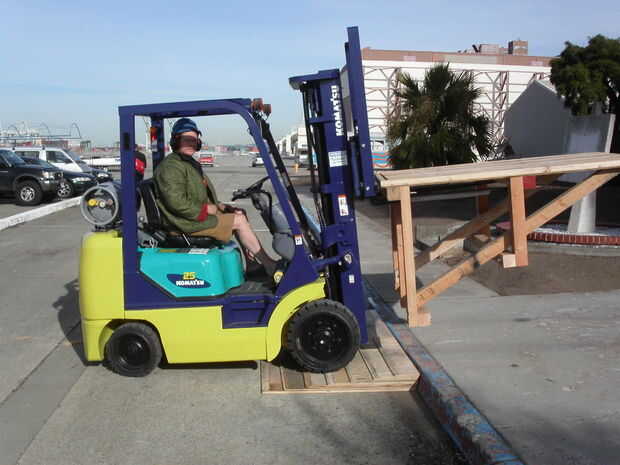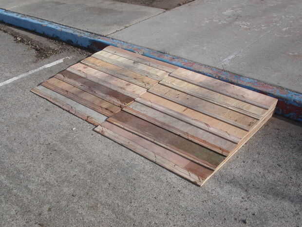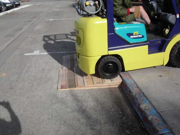 La rampa de banqueta está hecha de siete capas de madera contrachapada laminada apilados uno encima del otro. Las capas se corte con un borde biselado bastante grande con una sierra de mesa y luego martilló juntos en su lugar. Cada capa sólo levanta 3/4" y hace que el borde biselado para una conducción muy suave hasta la acera.