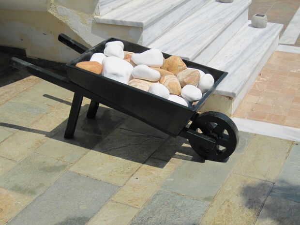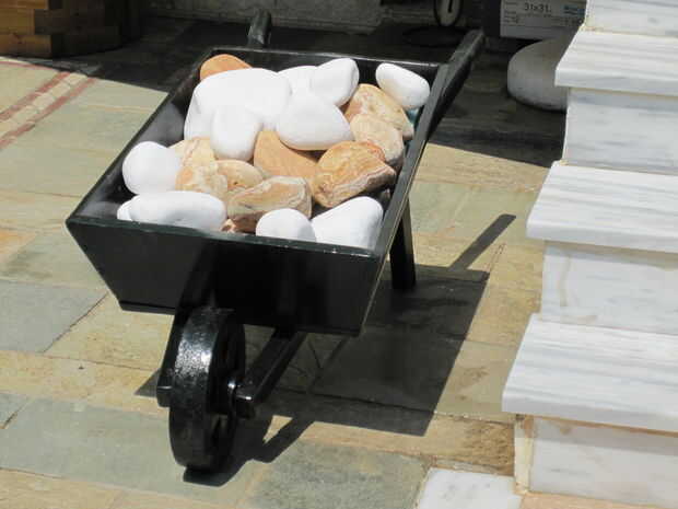 Una carretilla de madera totalmente me ayudaron en llevar artículos de jardín, pero afrter hace algunos años se convirtió en una pieza decorativa en mi patio. Puse en piedras de mármol blanco es agregando una nota especial en un rincón.