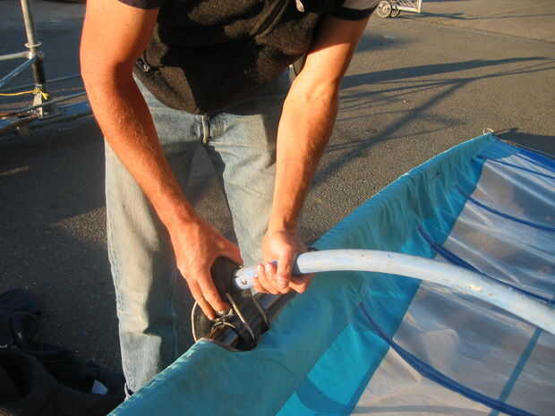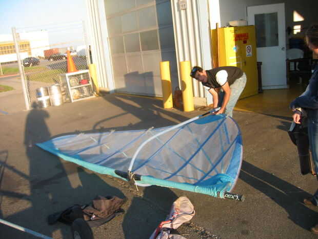 Puesto que el anillo de la manera es no el landyacht es un poco diferente a un windsurfista del aparejo. Meta el poste sobre el mástil del trozo y luego Caze la vela hasta que ve bien. "Parece buena" significa la parte superior de la vela es plana pero no flojo, y el vientre de la vela es de 7% del acorde.