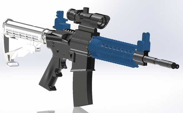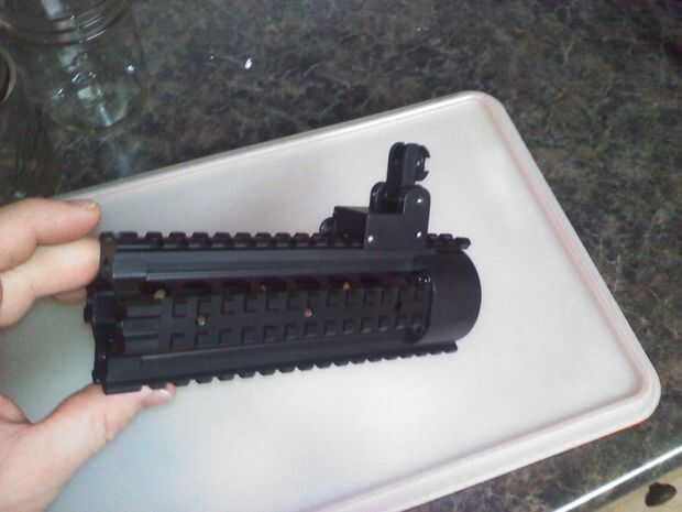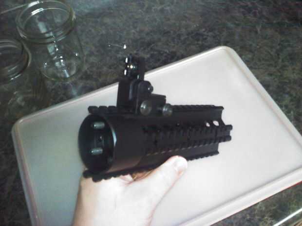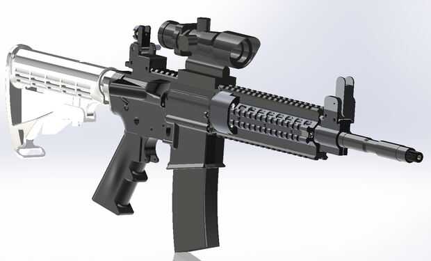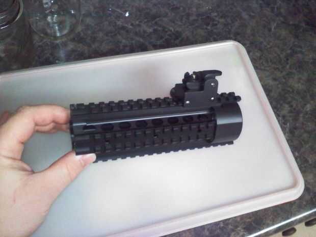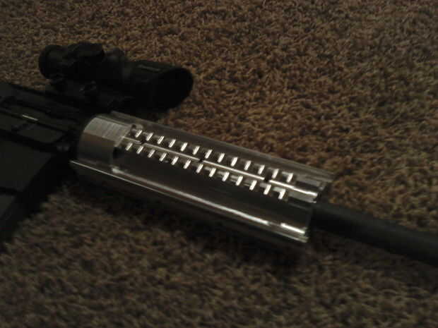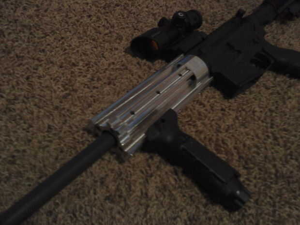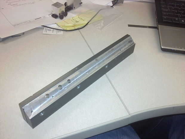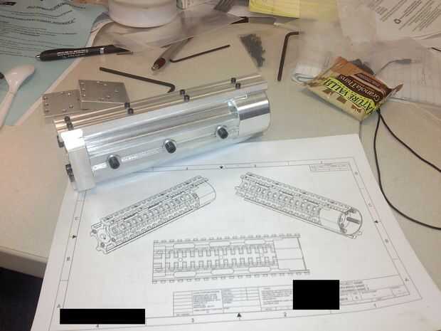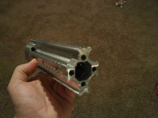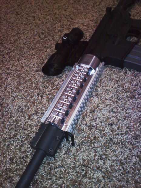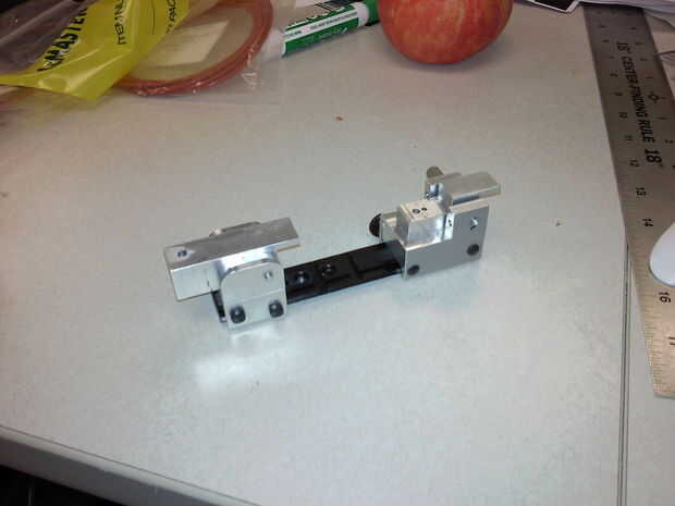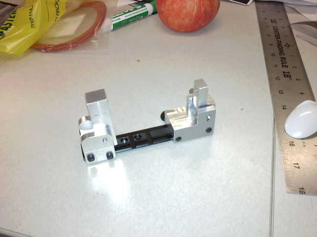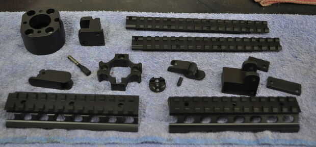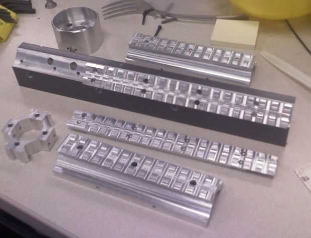 El carril cuádruple fue construido como un ensamblado utilizando hardware 4-40 y 8-32 mantiene juntos. Fue entonces cerakoted negro. Usé un molino de extremo de bola de 1/4" para suavizar las transiciones entre superficies angulosas.
