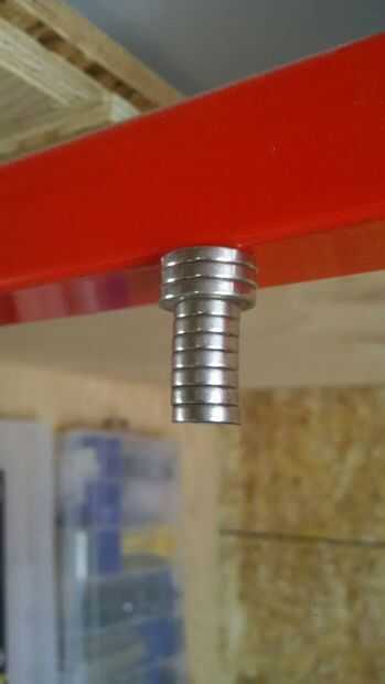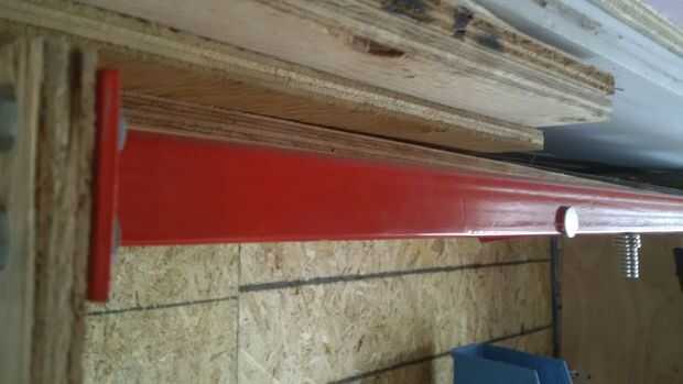 Lo primero que necesita es un riel de acero sobre el área de trabajo. La mía es esta belleza en el primer cuadro, hecho de tubo de 1 1/4" de acero y recubrimiento en polvo naranja. No hay necesidad de obtener lujo aunque. Todo lo que necesitas es una superficie estable encima de la cabeza para pegar imanes.