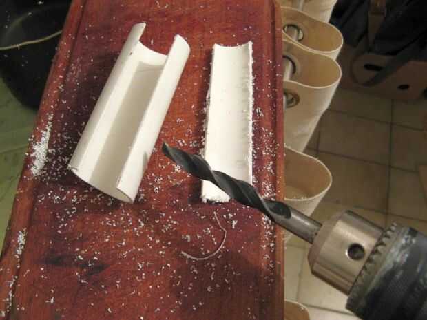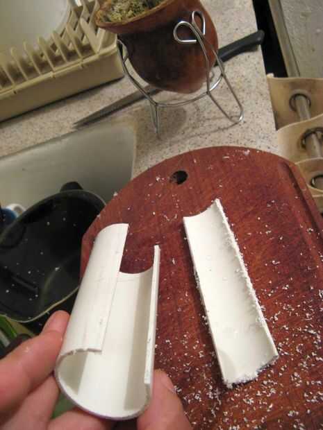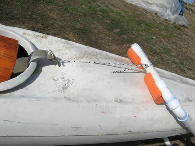 Puede usar pieza breve de un tubo de PVC más grande para hacer dos ganchos para fijar la cuerda a la piragua. Corte el tubo grande de PVC en dos, abrirlos y hacer agujeros para ambas partes, como muestra la imagen. Hay nuestros ganchos.