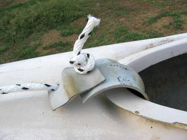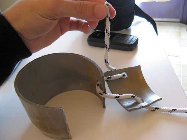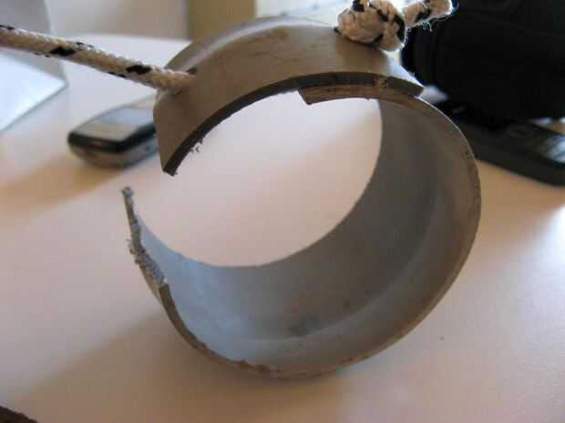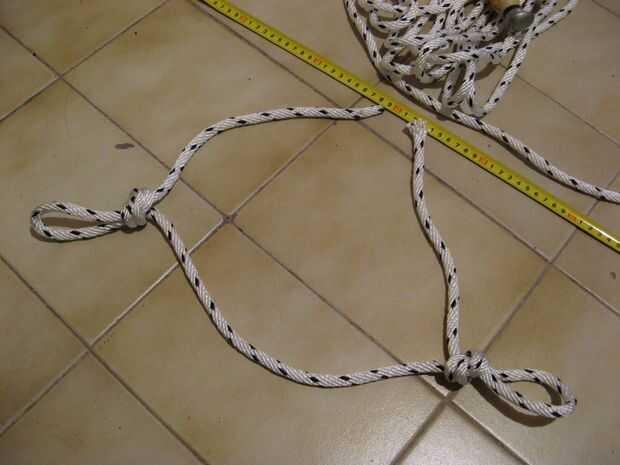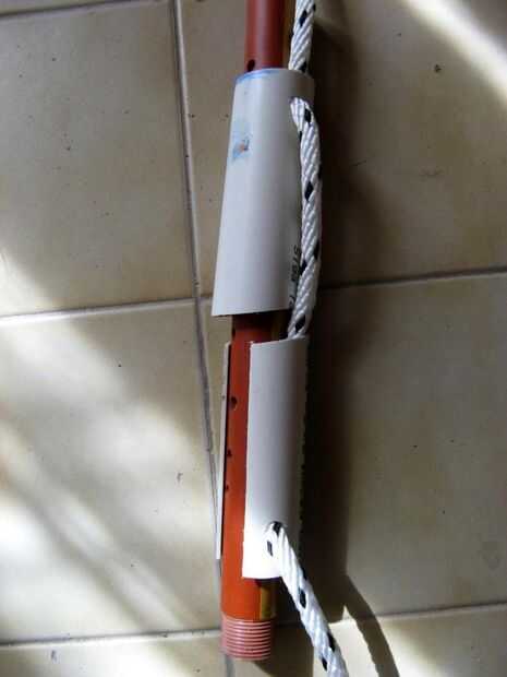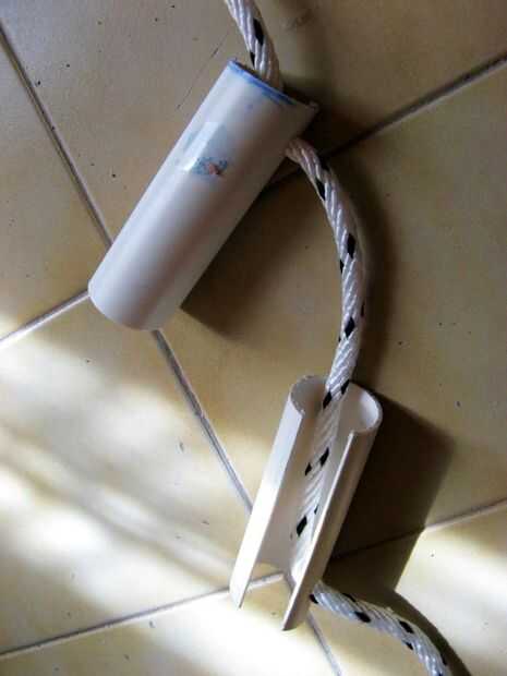 Puede utilizar piezas del tubo largo 40mm PVC para hacer una especie de "cerradura del remo": tomar dos piezas de tubo (alrededor de 15cm está bien) y cortarlas linke el cuadro. Hacer un agujero (el mismo diámetro de la cuerda) y coloque la cuerda por los agujeros como en la foto.