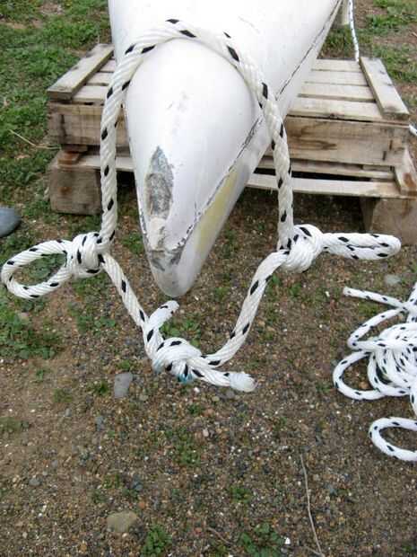 Agarrar un pedazo de cuerda y hacer dos nudos tipo "asa", y cerrar la soga en sus extremos como muestra la foto. Kayak de la del esto se colocara en la punta (la apunta hacia adelante cuando lo estes moviendo con el carrito). La forma y posición de cada "asa" tiene ser fija, es decir no las hagas ajustable sni "corredizas".
