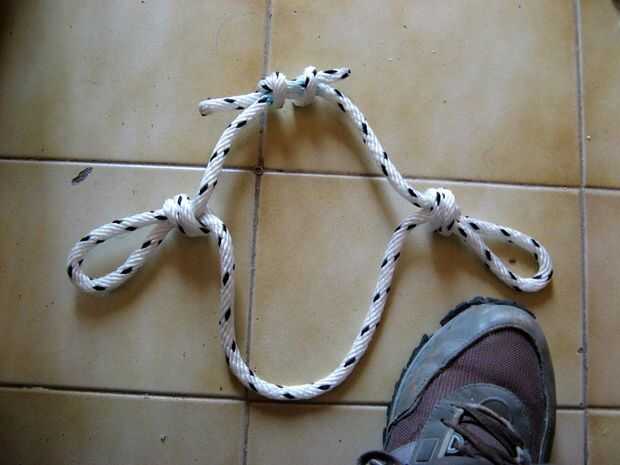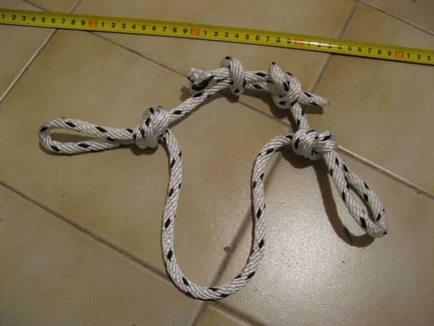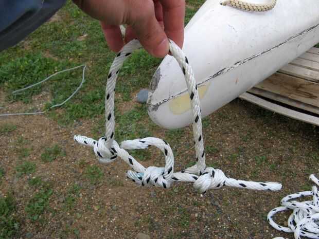 Tome un pedazo de cuerda y hacer dos nudos de la "manija" y cerrar el ciclo, como se muestra en la foto. Esto pondrá en la punta de la piragua (la punta que se señalan adelante cuando era remolcado). Deben fijarse el tamaño y la posición de los dos "nudos de manejar".