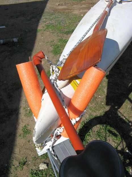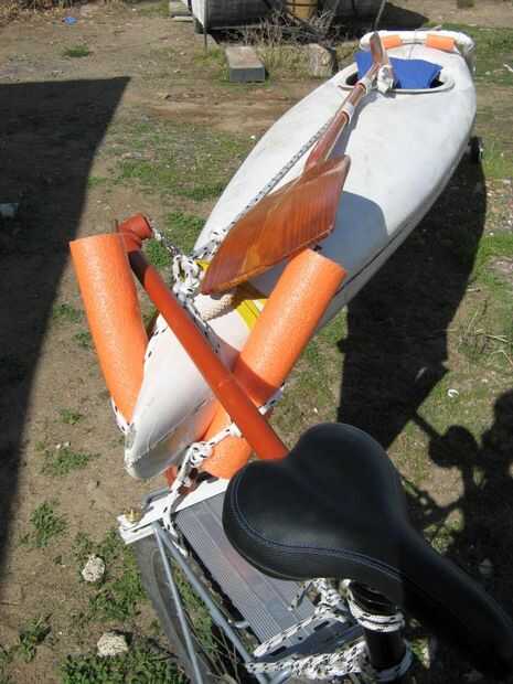 La primera foto muestra cómo la punta del kayak el kayak será descansar en la forma de V mientras que siendo remolcado en su bicicleta.