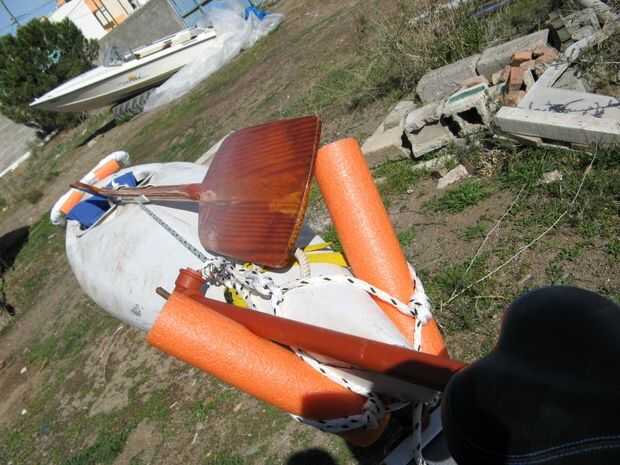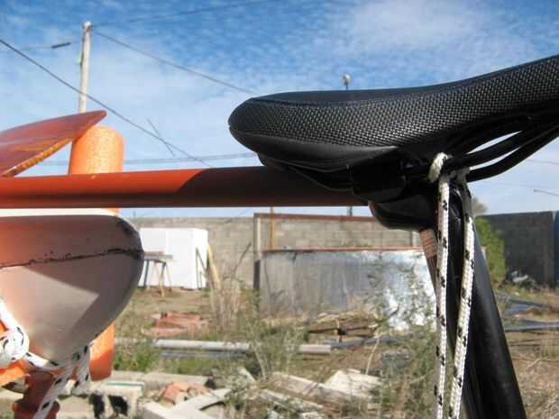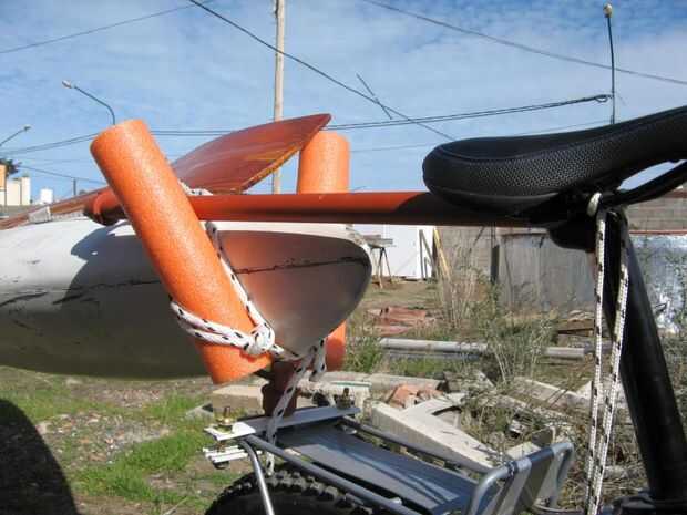 Lo importante que hay tener en cuenta es el tubo de PVC debe mantener la distancia entre tu espalda (o culo!) y la punta del kayak cuando tu bici se detenga bruscamente. Considerando eso, podes ajustar la soga, el gancho (lo podes sacar de la correa de tu perro), las distancias, etc.. En mi caso, el punto de apoyo es la parte trasera del asiento.