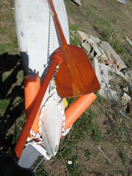 Ahora podemos poner el carrito, las cuerdas (con los ganchos y sujetadores para remos) en el kayak. Ajustar la cuerda de la punta del kayak utilizando cualquier cinta o cuerda ajustable. La cuerda ajustable debe pasar por las dos nudos en formas de "asas" y debe enganchar la cuerda lleva los sujetadores del remo y termina en el gancho de PVC. Ver las fotos.
