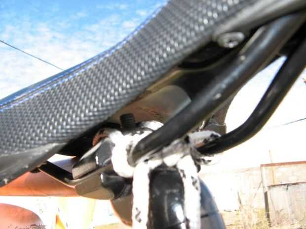La razón de utilizar el respaldo de mi asiento es su altura: Si utiliza una parte más inferior, causará problemas al girar (¡ pruébelo!). Si su asiento es demasiado bajo porque las piernas o bicicleta ajuste bien, usted necesita averiguar que "detener mancha" utilizas (el punto de contacto entre el tubo de PVC y bici).