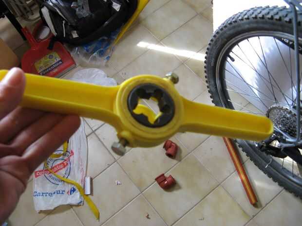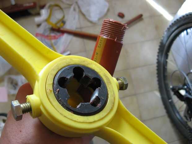 3) hacer las roscas con la terraja en los dos extremos del tubo de PVC permiso de 3/4", para poder luego enroscar los adaptadores de 3/4" a 1/2" en cada extremo.