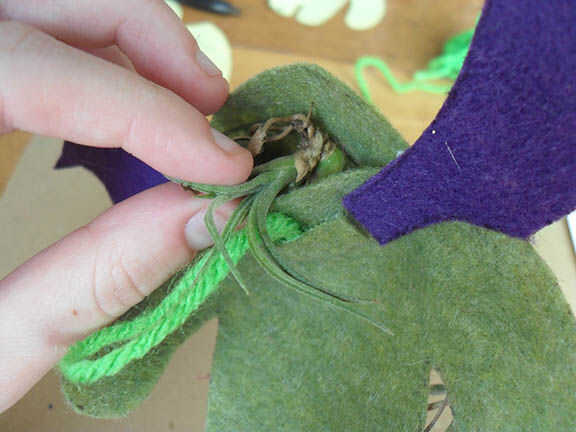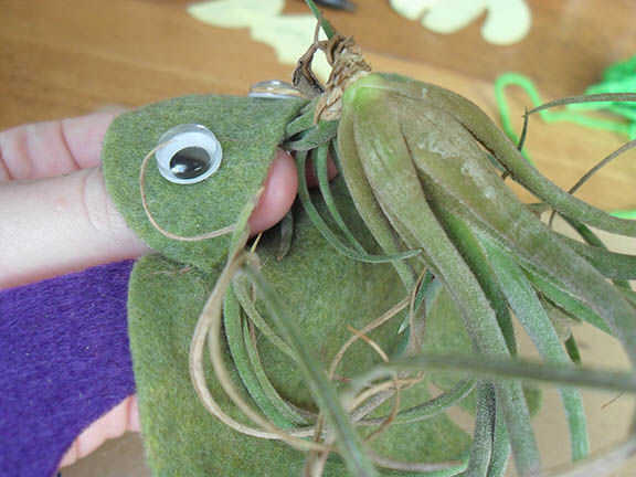 Suavemente del hilo de rosca unos zarcillos de la planta de aire a través de la abertura debajo de la cabeza. Puede que desee utilizar algunas piezas que ya están muertas o secas que doblando no daña la planta. Plantas de aire son generalmente rígidas, debe agarrar bastante bien en y apoyar el resto de la planta. La mayor parte de su follaje se debe colgar en la parte delantera, que sirven como sus tentáculos.