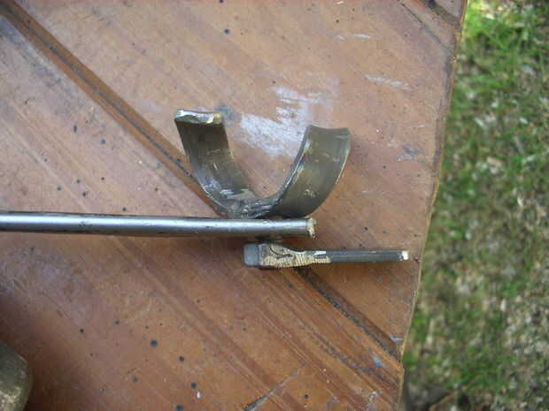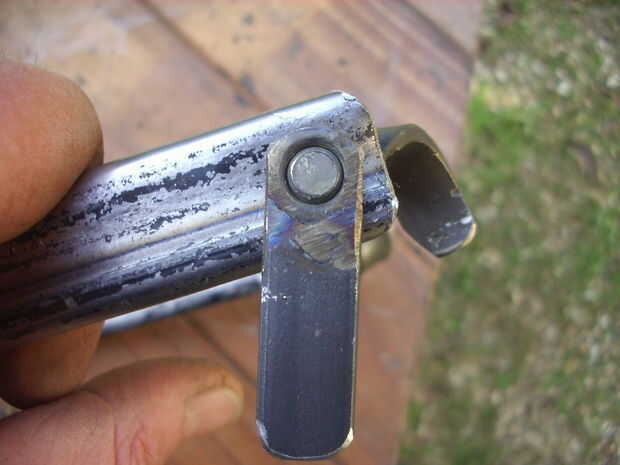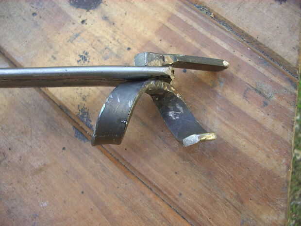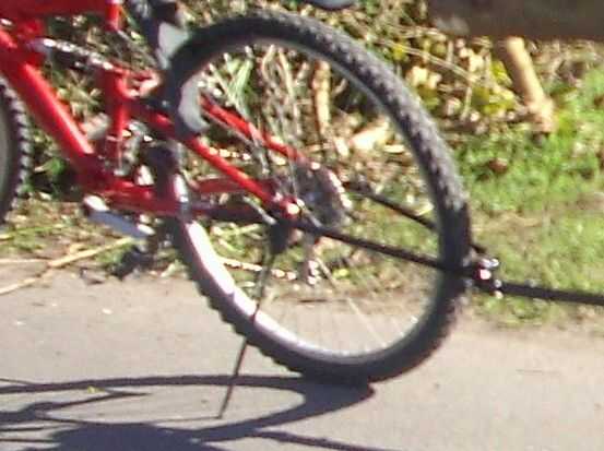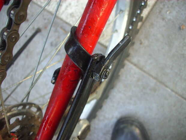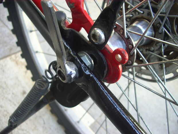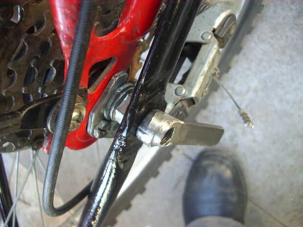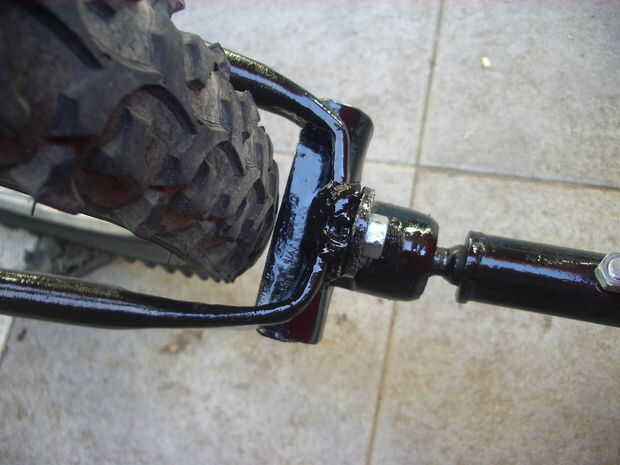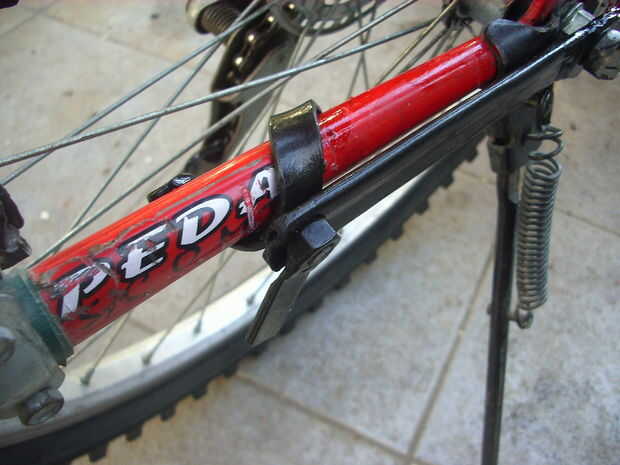 Ligeramente curva los extremos de los brazos de el para que cuando la horquilla se coloca en el eje trasero de la bicicleta, puede fijarse a los tubos horizontales de la bicicleta y la estancia final posterior a la misma altura que la rueda ejes del coche (se ve más fácil en las fotos que con tal palabrería). Para realizar esta conexión más fácil de poner y quitar, he utilizado la misma técnica de la manija de chulengo, o una "vuelta" de una sola ronda varilla de hierro que tiene al lado un tornillo soldado con autógena. Girándolo 90 grados se puede quitar de su lugar, pero cuando presiona en su posición, puños firmemente el lado tubo de la bicicleta. Soldadas a cada tuerca una "ala" para convertirlas en mariposas (semi).