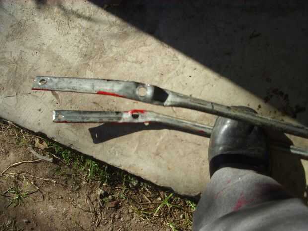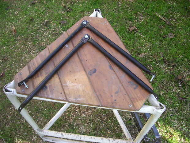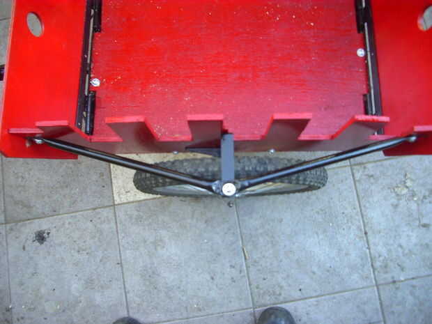 Hice algunos viajes por el barrio para traer troncos de leña para la salamandra, y esos viajes me ayudaron a identificar algunos defectos en el diseño. En primer lugar, como se mencionó en el paso 11, tuve que resolver el problema de aflojar el tornillo agarró el gancho. Otro problema era que la primera horquilla que hice tubo ligero y hace esfuerzos no resistidos a plena carga. Otro fue que una vez que una nueva horquilla más fuerte, los giros en el paso 12 que había hecho de chapa de 2 mm fueron deformados, así que tuve que rehacer con varilla simple de 1"/ 8. Por último y lo más preocupante, el contrachapado fenólico de 8 mm de los lados era demasiado flexible, y el peso de la carga rendido hacia ellos, ya que las horquillas de la rueda empujaron en esa dirección. Lo solucioné eso que complica un poco el diseño por cuatro puntales horizontales que van desde el exterior de las horquillas de la rueda las articulaciones de la cara con la frente y el fondo.