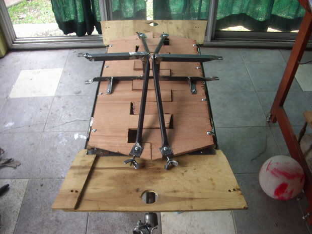 Cortar dos trozos de contrachapado fenólico de 8 mm de 60 x 30 cm para laterales, trapezoidales para que la caja resultante tenía una forma similar a la de una cuna. Cuando yo estaba atornillada a las barras/bisagras de lado me di cuenta que si tenía la intención de que se dobla hacia adentro, no podía ser más de 20 cm de alto, porque de lo contrario se golpean entre sí y cruzado. Pero ocurrió que me ida a: hacer en forma de dedos laterales, que pueden ser cruzados. Eso significaba matar dos pájaros de un tiro, como se explica a continuación (paso 17). Para el piso he utilizado contrachapado fenólico mismo.