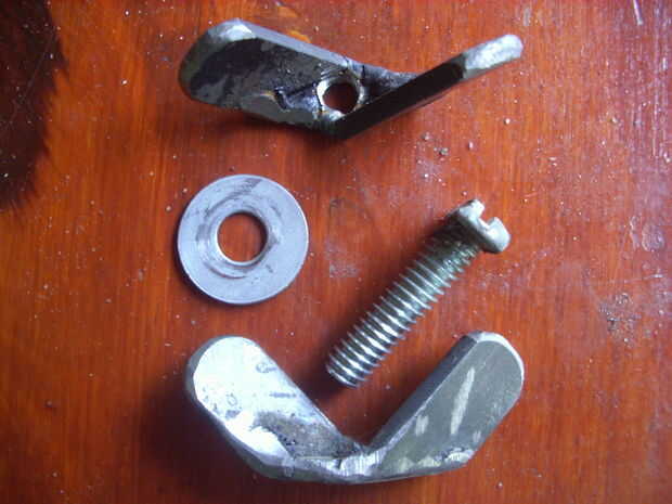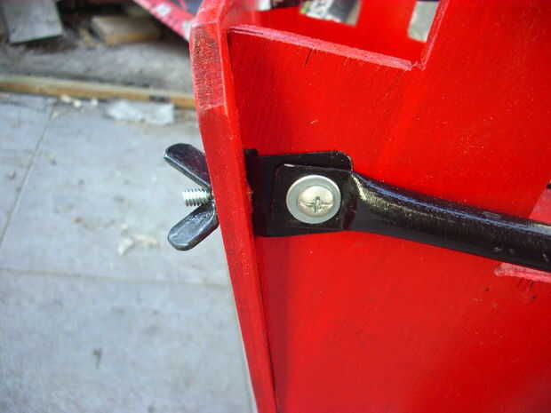 a los lados de la proa y popa que hice cuatro grapas U, hoja, con un orificio a través del cual pasa un tornillo de 1"/ 4 x 1" cuya cabeza ha sido allanado lateralmente para entrar y permanecer en la grapa impide girar. Hecho para cada tornillo una tuerca alada con vara de hierro 1"/ 2 doblado en U, a través del cual hice el agujero y rosca con llave de 1" / 4. Cada U se atornilla a un extremo de un lado.