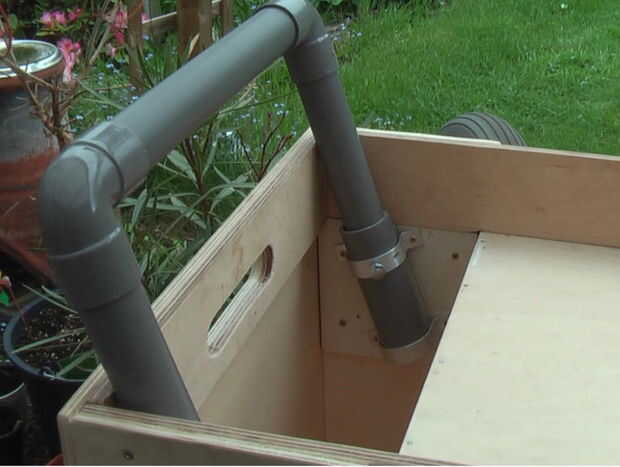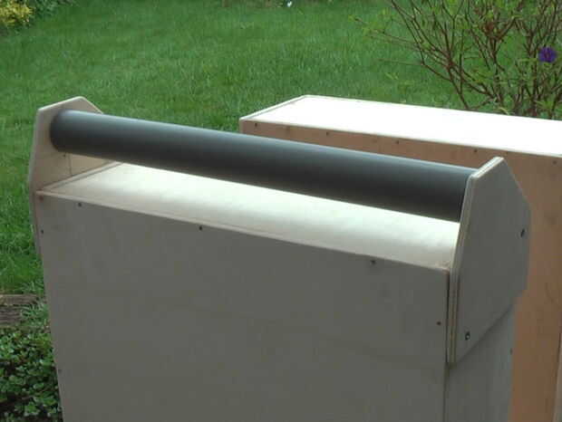Cuando el cuadro está listo podemos hacer los cuatro legholders. Son los laterales, donde las piernas plegables giran alrededor de su eje. Un tubo de PVC se utiliza como tubo separador. Véase el cuadro 4. Ahora también podemos hacer la barra telescópica del carro. El tubo exterior está conectado al carro por los soportes. Hay un pasador para fijar el manillar en la posición superior e inferior. Véase el cuadro 5 y 6. Hice 2 manijas en ambos lados de la caja para que sea fácil de llevar.