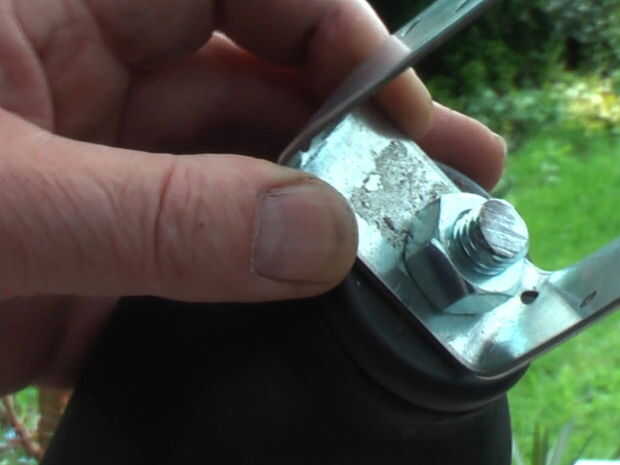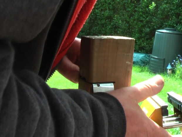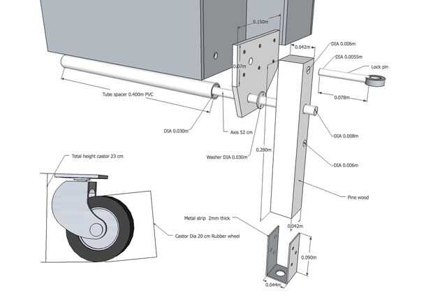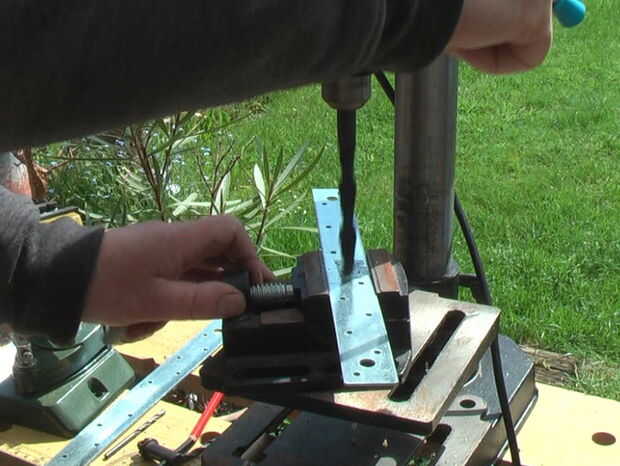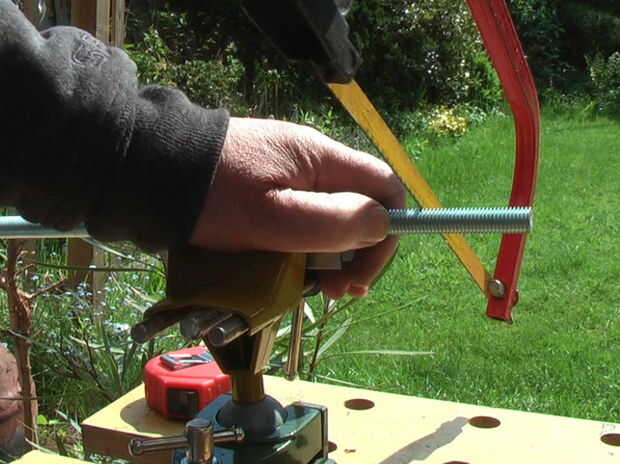 Para conectar el castor a la pierna que tenemos que doblar una tira de hierro en forma de U. Antes de eso, tenemos que perforar el agujero central de 12mm o 0,47 pulgadas. Cuadro 2 muestra una manera fácil de doblar la tira con un bloque de madera. Hice un corte con sierra circular, donde se adapta la tira. Cuadro 4 muestra los 12mm o 0,47 pulgadas por cable varilla. Tuve que cortar de una pieza de 55mm o 2,1 pulgadas para el eje de giro de la rueda. Véase el cuadro 5. El dibujo de construcción muestra las piezas con los tamaños. Las piernas están hechas de madera de pino; la sección es de 40 x 44mm o 1.57 pulgadas de x 1.73.