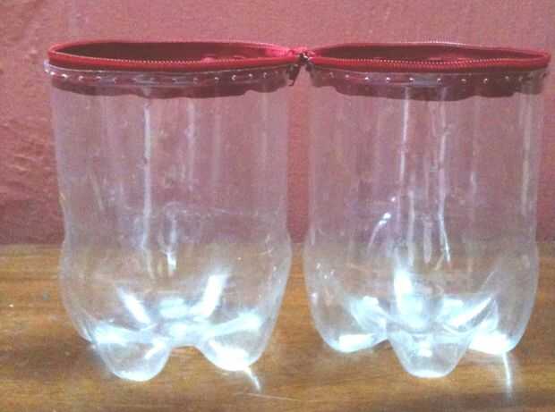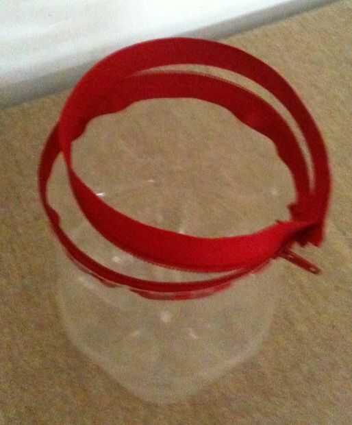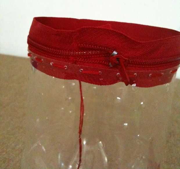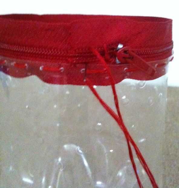 Ahora descomprimimos el zip y coser la parte superior de la cremallera para el 2 º Fondo de botella cortada. asegurar con un nudo