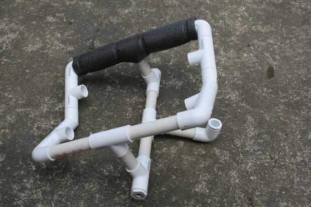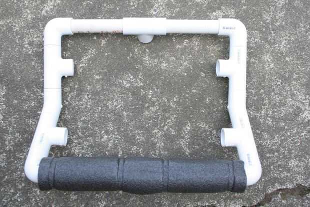 codo de 90 grados, 2" espaciador, T fitting, espaciador de 2", codo de 45 grados, 2" espaciador, T fitting, espaciador de 2", codo de 90 grados. Los 2 extremos terminada de forma de V deben ser imágenes de espejo uno del otro. Añadir los 2 lados y luego alinee según las fotos.