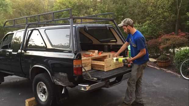 La plataforma del centro se deja caer en la cama y carrozas en el centro. Es bastante pesado de todos los de la 2 x 4 para no deslizarse. Las dos alas se colocan sobre la plataforma del centro en sus ranuras. Esta porción todo encaja cómodamente dentro del marco de la cama. Por último los tres cajones se insertan en sus ranuras.