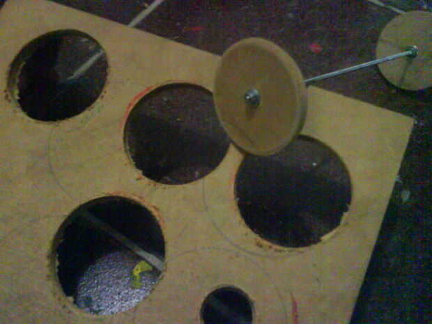 -Con el más pequeño pedazo de varilla de metal, sostiene las ruedas con la ayuda de las tuercas y arandelas, como indicado y poner en el taladro. Simplemente enchufe el taladro y golpear los bordes con la ayuda de papel de lija.