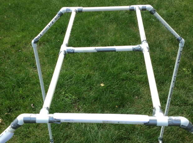 Corte cuatro piezas de PVC 40 pulgadas para los postes verticales.  Medir el ancho de su caja para la longitud de los soportes cruzados que se necesita.  Básicamente se hacen forma de trapecio de la parte superior utilizando las juntas de dos de 45 grados.