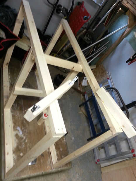 Recuerde cuando dije que no era una carpa, aquí es donde yo probarlo, je. Marco dos paredes con un perno en el centro, en lugar de dos. Puesto que sólo tenía 8 escuadras, hice los soportes medio ir toda la anchura de la plataforma. Los soportes extremos tiene los soportes en ángulo. Después tuve el esqueleto terminado, noté que era sólo un pelo fuera de escuadra. Que batirlo y batirlo como un stepkid rojo dirigido en vano. Se siente bastante sólido y eso me hace feliz. Pongo a la sierra en la parte superior para ver si es demasiado alto para usar. . Me gusta.
