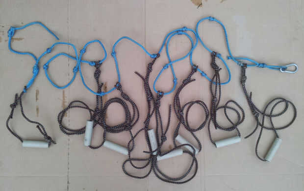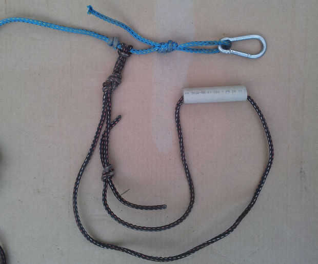 Hacer una barra principal como el azul de la imagen. El primer nudo al lado el mosquetón es un nudo de lazo de ocho, añadir un nudo doble cada 20 cm y el final como al principio. Para la barra de la manija, con el cable negro en la imagen, utilice un trozo de 10cm de una tubería de agua de plástico (el PE). Continuación, conecte los extremos de la cuerda con un nudo simple, cada cuerda de lados opuestos (o nada) y separar una parte del lazo otra vez con un solo nudo.