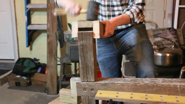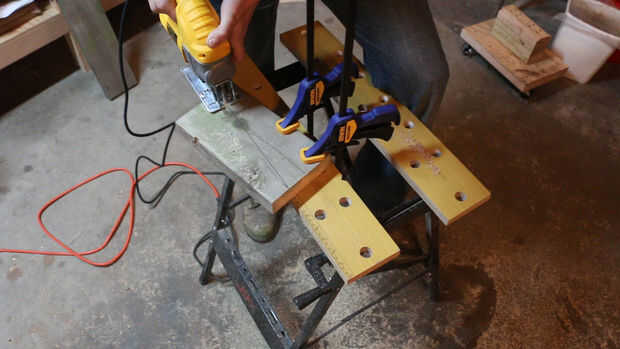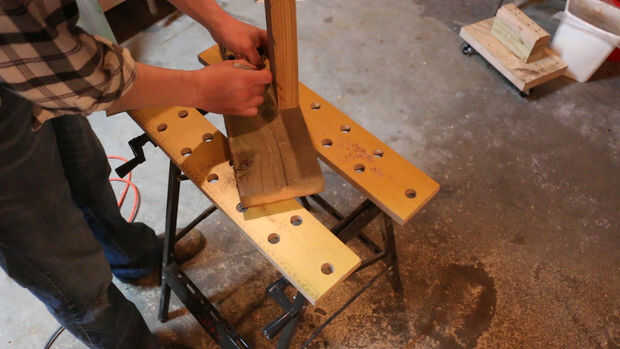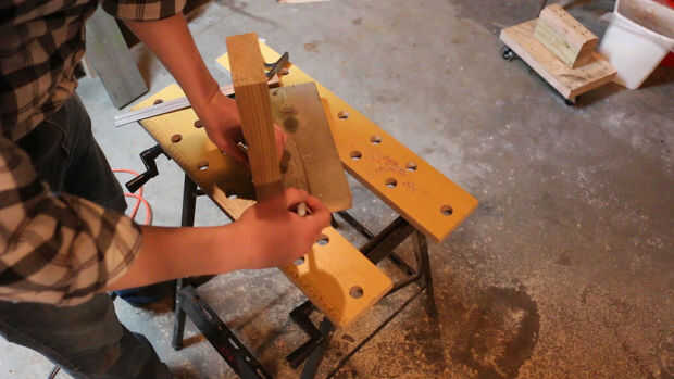 Cada lado tiene tres tablas: una tapa y dos llaves. Mi tapa era 10" de largo y 3 1/4" de ancho, pero el ancho sólo tiene que coincidir con la anchura de su 4 x 4. (¿Qué? 4 x 4 no es 4 x 4? Chanchullos!) Puede hacer referencia a la placa de extremo para ayudar a cortar las dos llaves cada una 2 x 6. Marcar la profundidad de la tapa en la parte superior derecha esquina, luego la parte inferior izquierda, luego utilice una regla y dibuja una línea entre dos puntos. Ahora, cuando usted corta a lo largo de esa línea, usted tendrá dos piezas de soporte biselada agradable.
