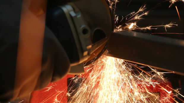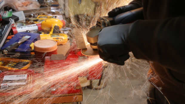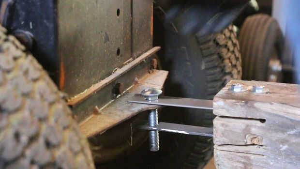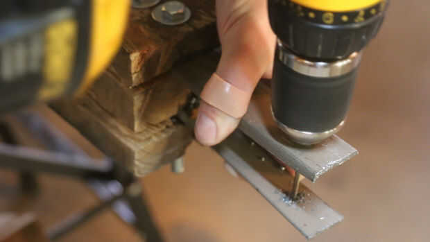 Rebanar el enganche de acero. He utilizado hierro de ángulo de un somier viejo. Querrás terminar con dos piezas planas, por lo que vas a tener que rasgar por la mitad a lo largo de la longitud. Para referencia, he creado dos piezas eran 7" de largo y 1" de ancho. Luego jam aquellas piezas en las ranuras, perforar algunos agujeros para los tornillos de enganche perno y tornillo todo juntos. Por perforación todo en su lugar, se puede más que todos los orificios se alineen.