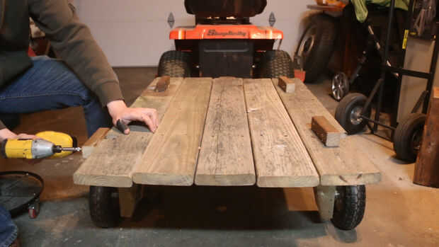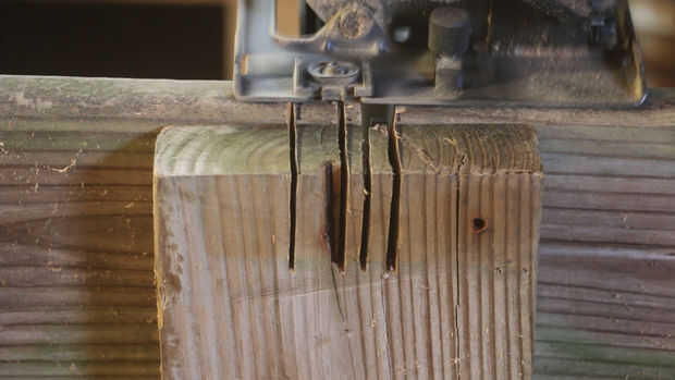 Comienza por cortar dos 2 x 2 muescas en el borde de la cama en medio de los tirantes a cada lado de los postes de pared de la caja. (Usted podría hacer esto antes de que usted coloque la cama, pero es factible de cualquier manera). Una vez más, tenga cuidado de aquí si estás usando una sierra circular. No sea como yo y cortar un tornillo! Atornillar la caja de inicio publicar los soportes en el exterior de las muescas. Como antes, estas piezas de 2 x 2 hay que pre perforado, o bien se te separan.