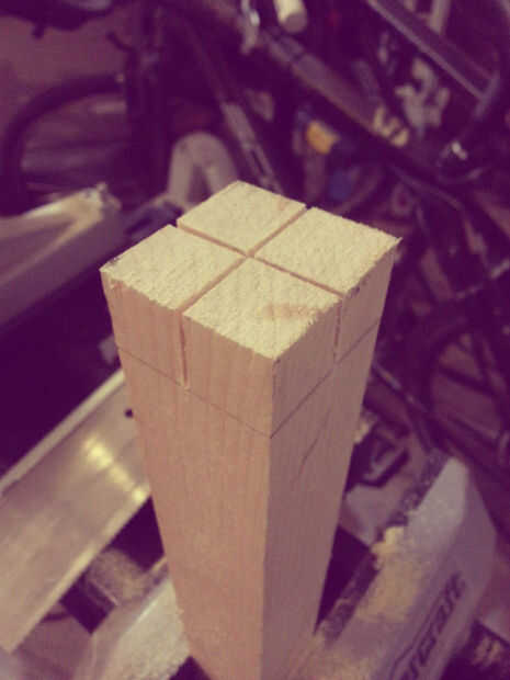 2" por 2" madera que había dejado de mi zancos para halloween fueron ligeramente más ancho que el tubo. Para acentuar la simetría, hice algunos pomos cuadrados que están al ras con los arcos y tienen dimensiones similares. La longitud total de estas piezas es igual a la anchura del rectángulo básico (10.5"). Utilicé algunas piezas sobrantes de tubo para medir la profundidad de los cortes con la Sierra de mano. Después de hacer la Cruz en la parte superior, puede convertirlo en el lado y corta dos de las plazas luego el otro, dejando el "mejor" que en su lugar. SER cuidadoso al cortar los cuadrados del otro extremo: necesita conservar la misma esquina que el primero tallado hacia fuera...