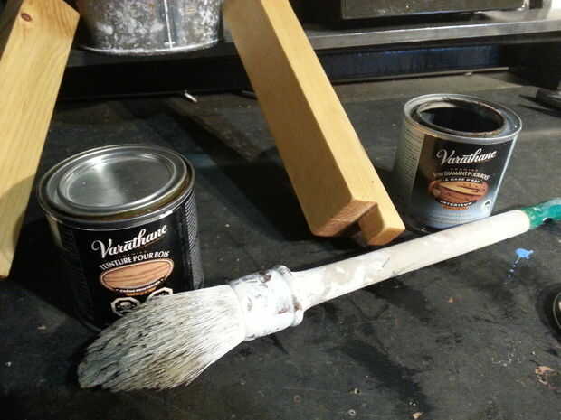 Una vez que han cortado las piezas, debe lijar los bordes para obtener un acabado liso. Usé una mancha que tenía en mano y aplicar tantas capas como sea necesario para obtener el color que quería igualar (la mesa de centro del vídeo). Luego apliqué 3 manos de barniz para ayudar a preservarlo.