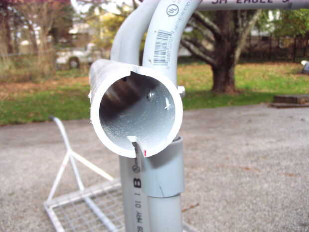 Los rieles laterales 1" conducto fueron superados con una sierra de cinta para anidar comodamente alrededor del exterior de los postes de 1 1/2". Los rieles fueron luego atornillados a los postes con tornillos y tuercas de seguridad. Se perforó un agujero más grande en el exterior de la entrada para permitir que la cabeza del tornillo y destornillador para caber a través de modo que la cara interior del post es la única parte atornillada a la baranda del lado. Esto permite el post seguir siendo claro para mangos de cañas y otros elementos verticales que llevas en estos tubos.