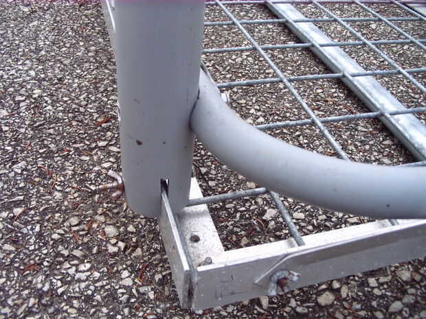 Las secciones redondeadas están unidas a los rieles laterales. Al final debe tener dos lados, cada uno con 2 postes y 3 carriles (con 2 secciones redondeadas por riel). Cortar ranuras en la parte inferior de los postes con una sierra circular, Sierra de cinta o caladora Sierra, para sobre la pierna hacia arriba el ángulo del larguero del bastidor. Montar los conjuntos laterales en los ángulos de tren marco para determinar la longitud de las piezas cortas que se conjunta los dos lados juntos. Se necesita 3 pequeñas secciones rectas de cada uno en la parte delantera y trasera de la jaula. Estos no llegar en condiciones de servidumbre si quiere romper el carro para el transporte. Estas piezas cortas encajan en los extremos ensanchados de las secciones de radio.